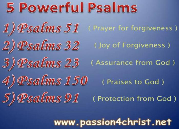 It begins with Psalms 51, asking god for forgiveness, continues with Psalms 32 believing that he forgives if we confess our sins, Psalms 23 which reminds that he will take care of all our needs, Psalms 150 which gives praises to the lord and finally Psalms 91 which is a powerful protection prayer. So in real you have covered all areas for a short prayer….God bless..